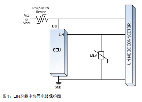 圖4為協(xié)同的電路保護圖,顯示出一個設置在功率輸入的可復位PolySwitch器件如何在電源輸入端保護ECU和LIN節(jié)點連接器免受過電流情況的損傷,以及一個MLV(多層電壓敏電阻器)如何為車載網(wǎng)絡應用提供所需的高電流處理和能量吸收的過電壓保護。