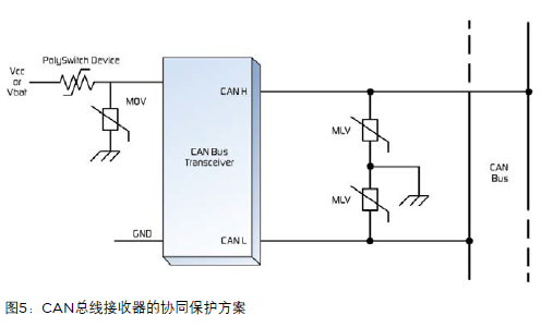 圖5顯示了如何在電源輸入端應用可復位PolySwitch設備和MOV(金屬氧化電壓敏電阻器)從而避免因車載供電系統(tǒng)中心的浪涌電流和電壓異常而產(chǎn)生的損傷。