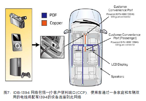 IDB-1394車載結(jié)構可分為內(nèi)置網(wǎng)絡和客戶便利端口,簡稱CCP,如圖7所示。該標準顯示了一種類似于現(xiàn)有MOST標準的一種內(nèi)置塑料光纖(POF)車載網(wǎng)絡。然后,該網(wǎng)絡更加穩(wěn)固且更易使用。多種電子元件可以連接到此網(wǎng)絡,如DVD播放器、視屏顯示器、導航系統(tǒng)、無線電主機以及通訊設備。