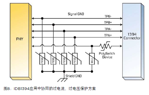 CCP端口包括一個車載等級1394b的物理層和連接器,允許用戶將便攜式設備連接到車輛,通過IDB-1394接口獲取音頻和視頻服務。CCP端口采用標準連接器,專為該設備供電而設計。其供電特點無需額外電池或單獨電源線,讓客戶無需為插入的設備是否已經(jīng)通電而擔憂。IDB-1394為高速多媒體應用而設計,總線速度高達800Mbps且要求通電端口具有可復位過電流保護。如圖8所示,PolySwitch設備可用于在出現(xiàn)故障時限制危險高電流。MLV可安裝到供電總線上避免ESD浪涌和過電壓瞬態(tài)所產(chǎn)生的損害。低電容PESD設備或PESD陣列也可安裝在數(shù)據(jù)線路上幫助提供ESD保護。
