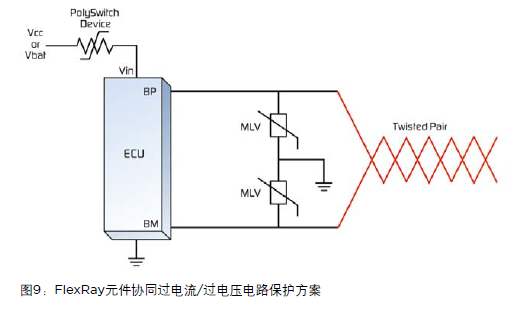 FlexRay協(xié)議專為線控應用所設計,如線控剎車和線控方向盤。該線控網(wǎng)絡方式支持同步和異步數(shù)據(jù)傳輸,數(shù)據(jù)傳輸率約為10Mb/s,具有時間觸發(fā)和事件觸發(fā)行為、冗位和容錯的特點。該結(jié)構支持一“束”2個節(jié)點至64個節(jié)點,其功能主要依靠于兩種類型的處理器—ECU和“活動星”。FlexRay通訊通過一個常用總線或一個星形連接在ECU之間進行。FlexRay元件的總線輸入必須避免在總線路和系統(tǒng)供電電壓或地電位之間出現(xiàn)短路現(xiàn)象。圖9顯示了ECU的調(diào)整后過電流/過電壓保護方案。該方案利用一個PolySwitch設備進行過電流保護,以及兩個傳統(tǒng)表面安裝結(jié)構的MLV進行ESD和瞬間過電壓保護。