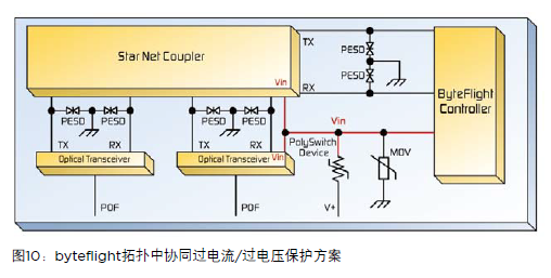 byteflight協(xié)議是一個車載數(shù)據(jù)總線,為提供車載元件之間進行非常安全且容錯的電子通訊手段而開發(fā)。byteflight在總線、星形或集群配置中通過2線或3線塑料光纖(POF)達到10Mbps以上的速度。該系統(tǒng)結(jié)構中使用POF使其功能能夠在數(shù)據(jù)方面達到電氣上的獨立。然而,節(jié)點仍然從車載供電總線處獲得電流,而且會受到電磁干擾的影響。構成該網(wǎng)絡的元件,如微處理器、byteflight控制器和光收發(fā)器,容易因供電尖峰和反向電壓而受到損傷。集成電路(ICs)或許包括ESD保護,但是通常限制在2kV以下。如圖10所示,PolySwitch設備和MLV可以保護這些模塊不受高能量過電壓和過電流瞬態(tài)的影響而產(chǎn)生損傷。