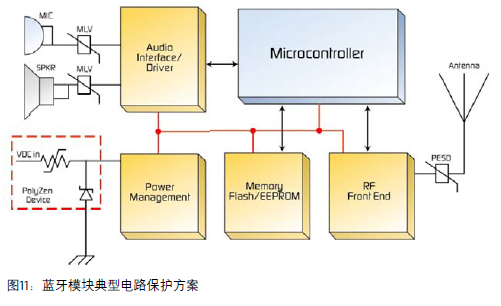 藍牙標準雖然最初并非為車載環(huán)境而設計,但已經(jīng)為車輛和其系統(tǒng)之間進行溝通的移動電子設備創(chuàng)造了新的市場前景,如手機、MP3播放器和導航設備。保護暴露在外的通訊界面不受因天線和儀器無線(RF)界面所產(chǎn)生的ESD和其他電壓浪涌的影響是一個相當重要的設計問題。圖2顯示了一個PolyZen集成過電流/過電壓設備如何幫助保護藍牙模塊的功率輸入。MOV或表面安裝的MLV也可用于避免車載麥克風和擴音器界面上出現(xiàn)電壓瞬態(tài)。PESD設備可以用于避免電線出現(xiàn)ESD浪涌。