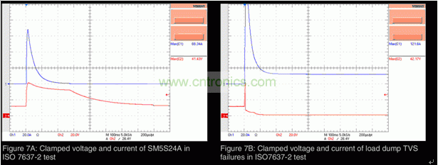 圖7A:在ISO 7637-2測試中SM5S24A的鉗位電壓和電流 圖7B:在ISO7637-2測試中甩負荷TVS失效情況下的鉗位電壓和電流