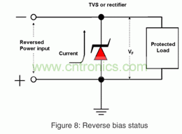 MOSFET的柵極在-1V或更低的反向電壓下也很脆弱。在反向電源輸入模式中,電源線的電壓域TVS VF的電壓相同。這種反向偏置模式會引起電子線路的故障。EPI PAR TVS的低正向壓降能夠很好地解決這個問題。保護電路免受反向電源輸入損害的另一個方法是在電源線中放一個極性保護整流器,如圖8所示。極性保護整流器應該有足夠的正向電流等級,以及正向浪涌和反向電壓性能。