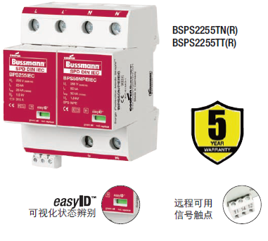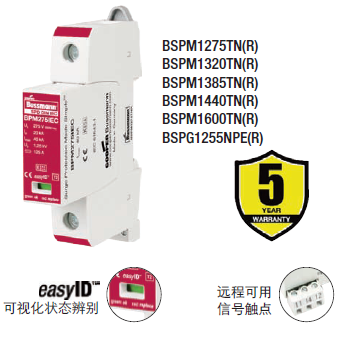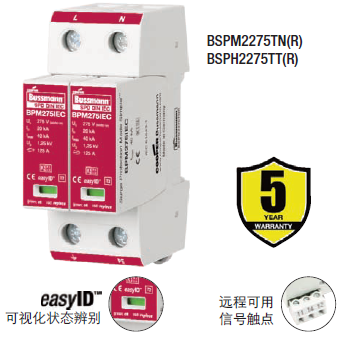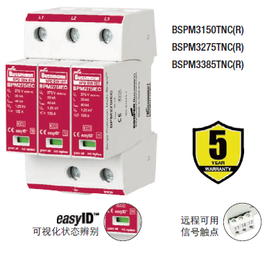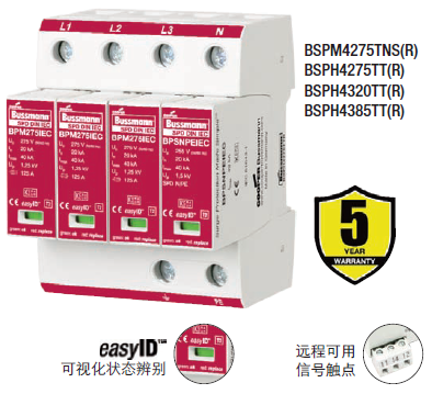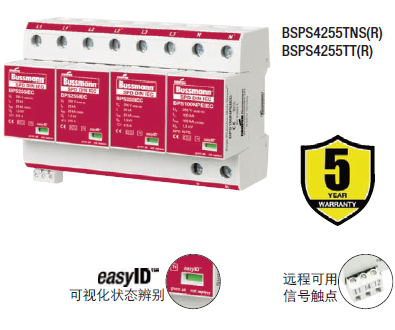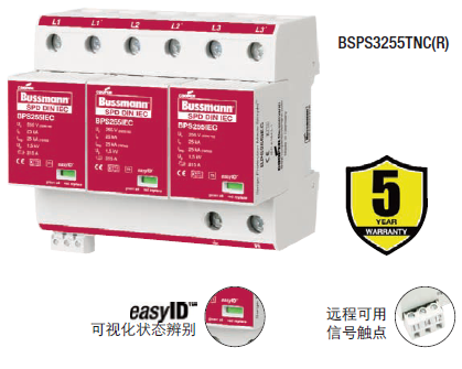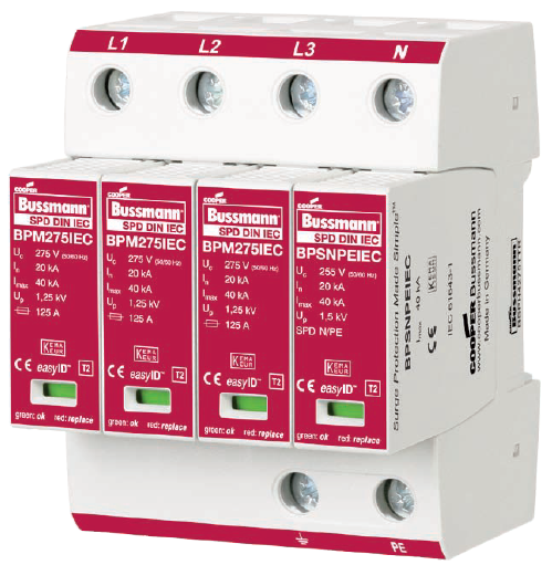 Cooper Bussmann IEC I級230伏、三極、結(jié)合了雷電流和浪涌保護器的模塊具有兩個特色:局部的、easyIDTM可視化辨別