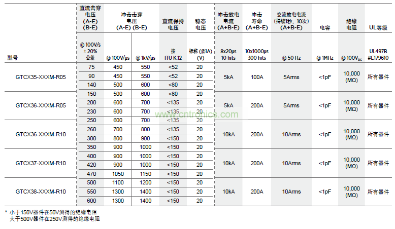表 G2 兩電極高壓GDT器件額定電壓值、額定浪涌值、電容值、絕緣電阻值和安規(guī)認證