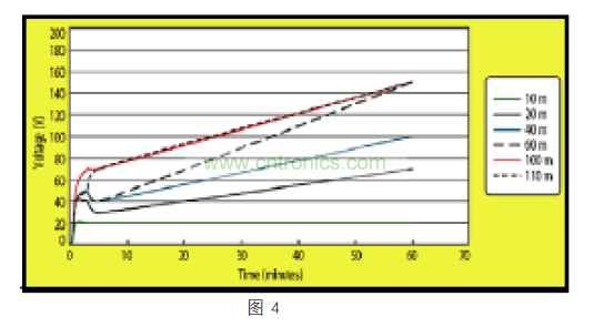 隨之而來(lái)的高能量放電可能會(huì)損壞連接器,變壓器電路,或以太網(wǎng)收發(fā)器。雙絞線電纜表現(xiàn)像一個(gè)存儲(chǔ)電荷的電容器。有研究證明,未連接到終端的雙絞線電纜可能會(huì)積累幾百伏的電荷。此外,在一個(gè)小時(shí)內(nèi),完全放電的電纜可以積累其所能積累總電荷的一半。一旦有了靜電,高品質(zhì)的電纜保留其所帶靜電的時(shí)間可以超過(guò) 24 小時(shí)。下面圖 4展示了不同長(zhǎng)度的 CAT5 電纜積累靜電如何隨著時(shí)間而變化。由于較長(zhǎng)的電纜有容量來(lái)存儲(chǔ)更多的電荷,電纜長(zhǎng)度超過(guò) 60m 的系統(tǒng)應(yīng)采取額外的 CDE 預(yù)防措施。