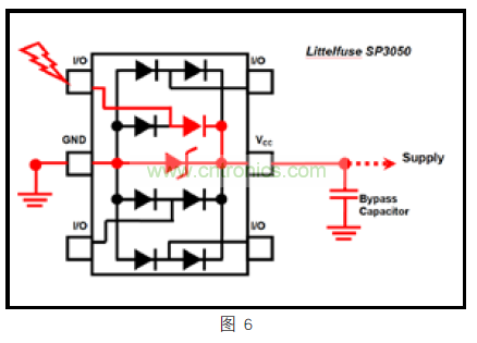通過(guò)連接 SP3050的 VCC 引腳,由于電氣瞬態(tài)兩個(gè)獨(dú)立的放電路徑,如下(圖 6)紅色所示,設(shè)計(jì)者將更好進(jìn)行夾緊設(shè)計(jì)??梢院?jiǎn)單地將它看作一個(gè)電阻分壓器,其中瞬態(tài)電流通過(guò)導(dǎo)向二極管,并選擇了兩條路,一個(gè)通過(guò)內(nèi)部 TVS到 GND,一個(gè)通過(guò)電源或外部旁路電容到 GND??偠灾?5 腳連接到電源,將導(dǎo)致更好的夾緊性能,給以太網(wǎng) PHY 提供更好的整體保護(hù)。