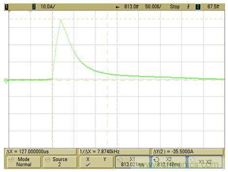 以下為實際應(yīng)用時量測到電源正常工作時的波形:電流尖峰 max 3.6A,寬度約為1.2ms;正常電流約為0.03A,正常工作時溫度可以達(dá)到85℃。