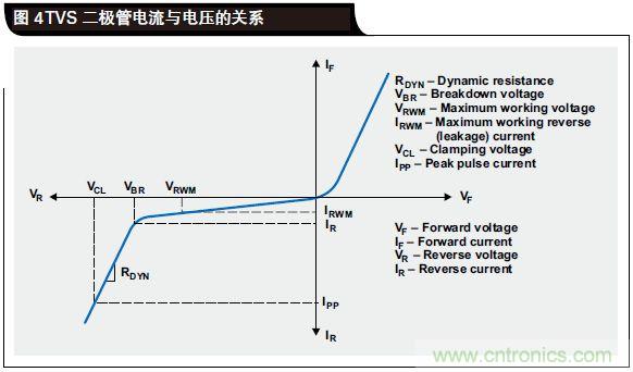 圖 4 顯示了 TVS 二極管電流與電壓特性的對比情況。盡管 TVS 是一種簡單的結構,但是在系統(tǒng)級 ESD 保護設計過程中仍然需要注意幾個重要的參數(shù)。這些參數(shù)包括擊穿電壓 VBR、動態(tài)電阻 RDYN、鉗位電壓 VCL 和電容。