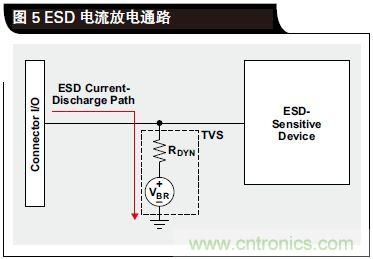 ESD 是一種極速事件,也就是幾納秒的事情。在如此短的時間內(nèi),TVS 傳導接地通路不會立即建立起來,并且在通路中存在一定的電阻。這種電阻被稱作動態(tài)電阻(RDYN),如圖 5 所示。