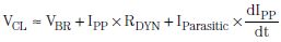 由于ESD是一種極速瞬態(tài)事件,I/O路線的電壓不能立即得到鉗制。如圖6所示,根據(jù)IEC 61000-4-2標準,數(shù)千伏電壓被鉗制為數(shù)十伏。如方程式1所示,RDYN越小,鉗位性能也就越好:其中,IPP為ESD事件期間的峰值脈沖電流,而Iparasitic為通過TVS接地來自連接器的線路寄生電感。