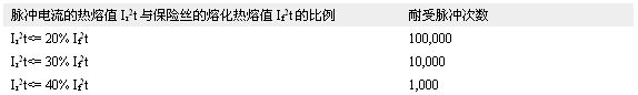 由于脈沖電流通過(guò)保險(xiǎn)絲的時(shí)候,會(huì)產(chǎn)生熱量,所以雖然單次脈沖的能量不足以使保險(xiǎn)絲熔斷,但多次脈沖沖擊會(huì)導(dǎo)致保險(xiǎn)絲熔斷。為了保證保險(xiǎn)絲可以耐受規(guī)定次數(shù)的脈沖電流,需要依據(jù)表3中所示的脈沖折減系數(shù)計(jì)算保險(xiǎn)絲的I2t規(guī)格。如果脈沖發(fā)生時(shí),保險(xiǎn)絲所處環(huán)境溫度高于室溫(+25°C),須做相應(yīng)的溫度折減。
