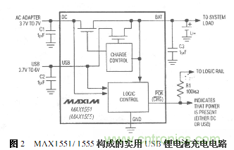 圖2是由MAX1551/1555構(gòu)成的一種實用USB鋰電池充電電路。MAX1551/1555是MAXIM公司設(shè)計生產(chǎn)的USB單節(jié)鋰電池充電芯片,為5引腳薄型SOT23封裝,允許USB接口或者墻壁AC適配器3.7V~7V范圍的電壓輸入。芯片內(nèi)部還具有溫度限制電路。