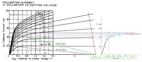 圖中假定電源電壓為4V,綠色的斜線是負(fù)載電阻為80歐姆的負(fù)載線,V/R=50MA,圖中標(biāo)出了Ib分別等于0.1、0.2、0.3、0.4、0.6、1.0mA的工作點(diǎn)A、B、C、D、E、F。據(jù)此在右側(cè)作出了Ic與Ib的關(guān)系曲線。根據(jù)這個(gè)曲線,就比較清楚地看出“飽和”的含義了。曲線的綠色段是線性放大區(qū),Ic隨Ib的增大幾乎成線性地快速上升,可以看出β值約為200。蘭色段開(kāi)始變彎曲,斜率逐漸變小。紅色段就幾乎變成水平了,這就是“飽和”。實(shí)際上,飽和是一個(gè)漸變的過(guò)程,蘭色段也可以認(rèn)為是初始進(jìn)入飽和的區(qū)段。在實(shí)際工作中,常用Ib*β=V/R作為判斷臨界飽和的條件。在圖中就是假想綠色段繼續(xù)向上延伸,與Ic=50MA的水平線相交,交點(diǎn)對(duì)應(yīng)的Ib值就是臨界飽和的Ib值。圖中可見(jiàn)該值約為0.25mA。