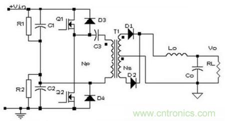 電容器C1和C2與開關(guān)管Q1、Q2組成橋,橋的對(duì)角線接變壓器T1的原邊繞組,故稱半橋變換器。如果此時(shí)C1=C2,那么當(dāng)某一開關(guān)管導(dǎo)通時(shí),繞組上的電壓只有電源電壓的一半。