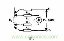 四線測(cè)量是將恒流源電流流入被測(cè)電阻R的兩根電流線和數(shù)字萬(wàn)用表電壓測(cè)量端的兩根電壓線分離開(kāi),使得數(shù)字萬(wàn)用表測(cè)量端的電壓不再是恒流源兩端的直接電壓,如圖2所示。