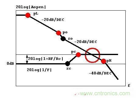 F中的極點(diǎn)和零點(diǎn)在1/F中相對應(yīng)為零點(diǎn)zc和極點(diǎn)pc,zc=1/2pi(RF+Rc)Cc,pc=1/2piRcCc,兩者之間的增益差為1+RF/Rc,從而使pc之后的1/F提升了1+RF/Rc,使1/F遠(yuǎn)離pH。