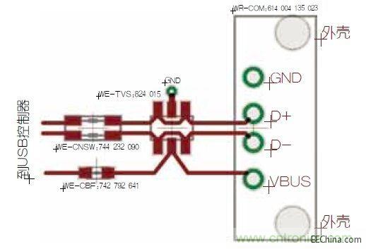 從圖3可以明顯看出,有兩條差分信號線(D+和D-)從插頭連接器連接到TVS二極管,再通過電流補(bǔ)償式數(shù)據(jù)線扼流圈連接到USB控制器。這樣能夠得到出色的靜電放電保護(hù)功能,并能良好的抑制數(shù)據(jù)線對。VBUS通過TVS二極管路由到貼片磁珠。在貼片磁珠之后,可以插入額外的電容和另一個(gè)貼片磁珠來實(shí)現(xiàn)最大可能的PI濾波器衰減。