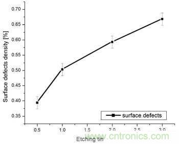 圖2.表面缺陷密度與蝕刻時(shí)間呈函數(shù)關(guān)系。