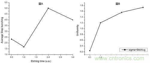 圖4.圖A為階褶數(shù)量與蝕刻時(shí)間的關(guān)系。圖B表面均勻度與蝕刻時(shí)間的關(guān)系。