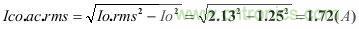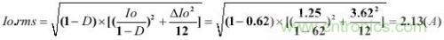 假設(shè)已知連續(xù)工作模式的反激變換器,其輸出電流Io為1.25A,紋波率r為1.1,占空比D為0.62,開關(guān)頻率為60kHz,由此可以計(jì)算次級(jí)紋波電流ΔIo和有效值電流Io.rms。