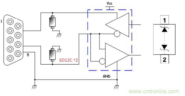 RS232接口一般為內(nèi)部配置接口,或短距離低速通信口,但此接口經(jīng)常插拔,需要采用功率300W以上產(chǎn)品進行靜電和浪涌保護,所以需采用SOD-323封裝的SD12C或SD15C(根據(jù)客戶芯片的工作電壓波動不同)來保護收發(fā)2路信號。
