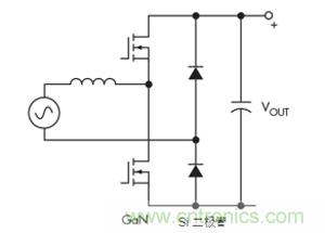 一種替代方案是連續(xù)導通模式圖騰柱拓撲。這種拓撲結(jié)構(gòu)充分利用了GaN的所有關(guān)鍵特性,最終導致尺寸更小、工作頻率更高的設計(圖4)。GaN的零反向恢復對于實現(xiàn)該拓撲特別重要。