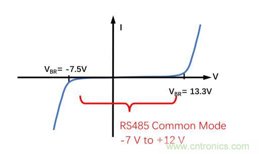 重要的是要確保TVS的擊穿電壓在受保護引腳的正常工作范圍之外。CDSOT23-SM712的獨有特性是具有+13.3 V和–7.5 V的非對稱擊穿電壓,與RS-485芯片ADM3485E的+12 V至–7 V的收發(fā)器共模范圍相匹配,從而提供最佳保護,同時最大限度地減小對RS-485收發(fā)器的過壓應(yīng)力。