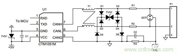 圖3.高防護(hù)CAN接口電路