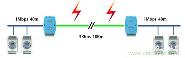 傳導(dǎo)防護(hù)主要是在傳輸線上進(jìn)行的。CAN總線的數(shù)據(jù)傳輸介質(zhì)一般為雙絞線,它主要的作用是抗低共模干擾,但是在面對(duì)浪涌、雷擊等情況時(shí)不僅沒(méi)有防護(hù)作用,反而易造成節(jié)點(diǎn)設(shè)備的損壞。因此,具備室外環(huán)境、長(zhǎng)傳輸距離、多節(jié)點(diǎn)設(shè)備特點(diǎn)的總線一般都要加隔離防護(hù)功能的網(wǎng)橋、