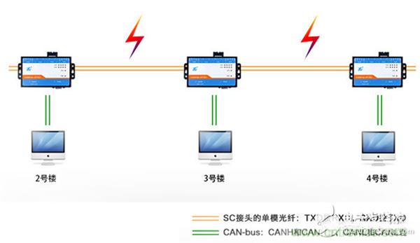 有沒(méi)有方法能徹底解決雷擊造成的隱患呢?答案是肯定的,只要數(shù)據(jù)的傳輸不依賴電信號(hào)就能完全隔離掉雷擊的危害。我們可以把CAN總線室外的部分或者說(shuō)容易受到干擾的部分使用光信號(hào)傳輸,這種方法目前已經(jīng)廣泛應(yīng)用于高速鐵路、地鐵、煤礦、醫(yī)療、航空航天、樓宇安防、電梯控制等場(chǎng)合。