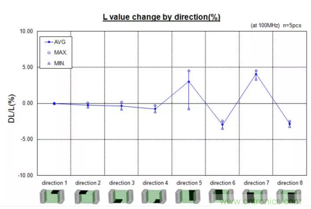 可以看出,標(biāo)記點朝側(cè)面,感值變化較大,所以貼片時應(yīng)注意讓電感上的標(biāo)記點朝上。
