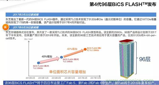 東芝電子(中國)有限公司副總經(jīng)理野村尚司表示東芝在2017年已經(jīng)推出了最新一代的64層BiCS FLASH器件,通過采用TLC技術(shù)實(shí)現(xiàn)了512Gb單Die(晶元切割單位)的容量。它通過16個(gè)Die堆疊 結(jié)構(gòu)實(shí)現(xiàn)了1TB的單一封裝容量,該產(chǎn)品計(jì)劃于2017年4月開始付運(yùn)。