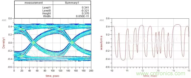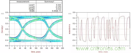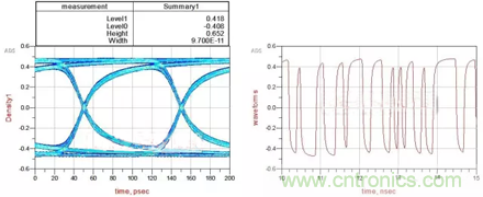 從結(jié)果可以看到:眼圖的寬度為97ps,高度為0.652V,信號的峰值為0.479V。