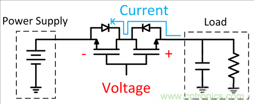 為了在FET關(guān)閉時(shí)阻斷兩個(gè)方向上的電流,你還可以將FET背靠背連接。與二極管解決方案相比,電源到負(fù)載的壓降更低,不過(guò)這種實(shí)現(xiàn)方式占用了大量的電路板面積。圖3顯示了用來(lái)阻斷反向電流的背靠背FET示例。