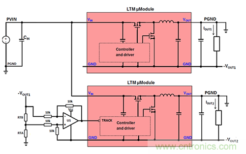 TRACK引腳輸入允許μModule穩(wěn)壓器通過將跟蹤信號(即,主μModule穩(wěn)壓器的輸出電壓軌的分壓版本)提供給從μModule穩(wěn)壓器的TRACK引腳來跟蹤另一電源軌的輸出電壓斜坡。每個μModule穩(wěn)壓器內(nèi)部控制器所看到的TRACK引腳電壓與其μModuleGND引腳相關(guān),但在需要配置兩個負輸出轉(zhuǎn)換器進行跟蹤的應(yīng)用中,μModule穩(wěn)壓器的GND引腳可以處于不同的電位。主和從GND引腳電位差異意味著主設(shè)備提供的跟蹤信號不能直接施加到從設(shè)備的跟蹤引腳。在這些類型的應(yīng)用中,需要額外的考慮以確保從機相位能夠看到來自主機相位的正確參考的跟蹤信號。