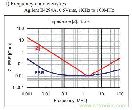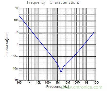 MLCC有經(jīng)典的V型阻抗-頻率曲線。隨著頻率升高,寄生電感的影響開(kāi)始凸顯,阻抗先變小再變大,這是MLCC的固有特性。曲線中的最低點(diǎn)就是MLCC的自諧振頻率。