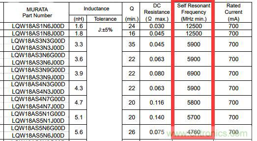 C0G/NP0類的低損耗電容和高Q值RF繞線電感datasheet中一般都會(huì)主動(dòng)標(biāo)出自諧振頻率的具體值和測(cè)試方法。簡(jiǎn)單地說(shuō),電容在低于自諧振頻率的區(qū)間內(nèi)才有作為容性元件的利用價(jià)值,電感在自諧振頻率內(nèi)才有作為電感的利用價(jià)值。