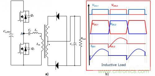 圖a)是典型的LLC串聯(lián)諧振電路。圖b)是感性負載下MOSFET的工作波形。由于感性負載下,電流相位上會超前電壓,因此保證了MOSFET運行的ZVS。要保證MOSFET運行在感性區(qū),諧振電感上的諧振電流必須足夠大,以確保MOSFET源漏間等效的寄生電容上存儲的電荷可以在死區(qū)時間內被完全釋放干凈。