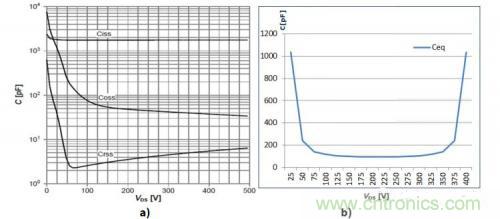 公式看上去雖然簡單,然而一個關于MOSFET等效輸出電容Ceq的實際情況,就是MOSFET的等效寄生電容是源漏極電壓Vds的函數(shù),之前的文章對于MOSFET的等效寄生電容進行過詳細的理論和實際介紹。,也就是說,等效電容值的大小會隨著Vds的變化而變化。如下圖所示,以Infineon的IPP60R190P6為例:
