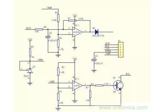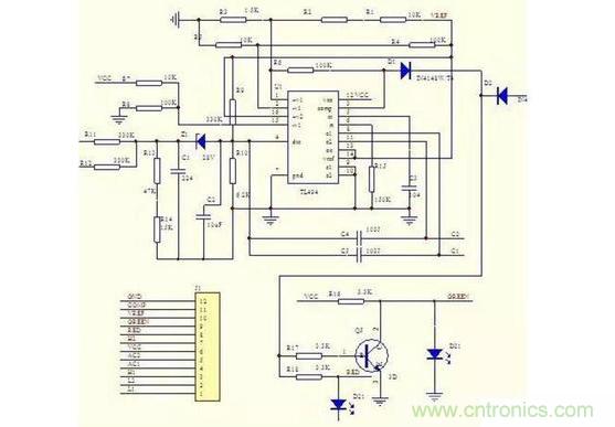 電路中采用雙運(yùn)放比較放大器LM358來(lái)控制輸出過(guò)流保護(hù),輸出電壓過(guò)低保護(hù)電路,TL431在此設(shè)制2.5V基準(zhǔn)電壓,給比較器同相輸入端作參考電壓,第一組運(yùn)放的同相輸入端接輸出電流檢測(cè),反相輸入端接參考電壓,當(dāng)電流過(guò)大,比較器輸入電壓升高,當(dāng)超過(guò)2.5V時(shí),輸出端輸出高電平,送入IC1的3腳,IC關(guān)閉輸出。第二組運(yùn)放同相輸入端接參考電壓,反相輸入端接輸出電壓,當(dāng)電壓過(guò)低,檢測(cè)分壓后電壓低于2.5V時(shí),輸出端輸出高電平,Q1導(dǎo)通,蜂鳴器報(bào)警。