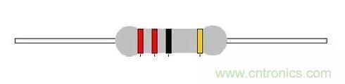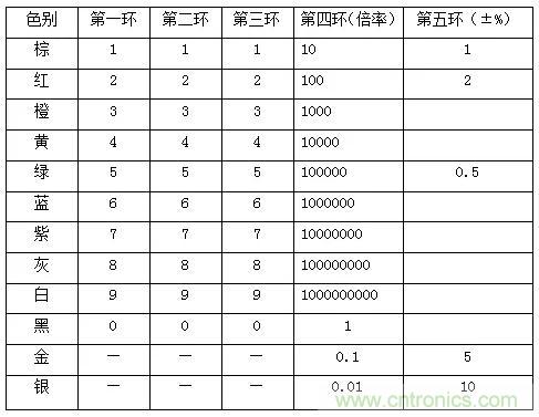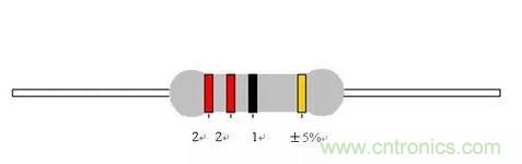 如:一個(gè)電阻第一環(huán)為紅、第二環(huán)為紅、第三環(huán)為黑、第四環(huán)為黑、第五環(huán)為棕色,則其阻值為:紅:2;紅:2;黑:0;黑:1倍;棕:±1%。
