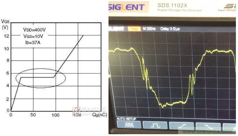 有了以上模型,就好辦了,尤其從運放這張圖中,可以一眼看出,這就是一個反相積分電路,當(dāng)輸入電阻較大時,開關(guān)速度比較緩慢,Cgd這顆積分電容影響不明顯,但是當(dāng)開關(guān)速度比較高,而且VDD供電電壓表高,比如310V下,通過Cgd的電流比較大,強的積分很容易引起振蕩,這個振蕩叫米勒振蕩。所以Cgd也叫米勒電容,而在MOS管開關(guān)導(dǎo)通或者關(guān)斷的那段時間,也就是積分那段時間,叫米勒平臺,如下圖圓圈中的那部分為米勒平臺,右邊的是振蕩嚴(yán)重的米勒振蕩: