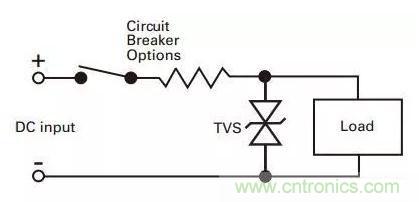 在實際的電路中,如圖2所示,在DC input的時候,有時由于供電環(huán)境的變化會帶來一些瞬時脈沖。而要消除瞬時脈沖對器件損害的最好辦法,就是將瞬時電流從敏感器件引到地,一般具體做法是將TVS在線路板上與被保護線路并聯(lián)。這樣,當瞬時電壓超過電路正常工作電壓后,TVS將發(fā)生雪崩擊穿,從而提供給瞬時電流一個超低阻抗的通路,其結果是瞬時電流通過TVS被短路到GND,從而避開被保護器件,并且在電壓恢復正常值之前使被保護回路一直保持截止電壓。而當瞬時脈沖結束以后,TVS二極管再自動恢復至高阻狀態(tài),整個回路又回到正常電壓狀態(tài)。