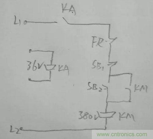 下面我畫了一個簡單的36v電源控制線圈電源為380v的接觸器的控制線路,供大家參考,也請大家多多指教。