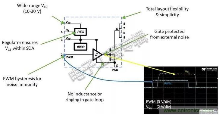寬范圍Vcc;調(diào)節(jié)器可保護(hù)SOA內(nèi)的VGS;滯后的PWM可抗噪聲干擾;整體布局靈活簡(jiǎn)潔;柵極可防止外部噪聲。