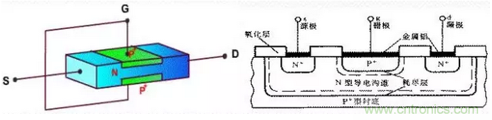 ※場(chǎng)效應(yīng)分類(lèi):場(chǎng)效應(yīng)管主要有結(jié)型場(chǎng)效應(yīng)管(JFET)和絕緣柵型場(chǎng)效應(yīng)管(IGFET)。絕緣柵型場(chǎng)效應(yīng)管的襯底(B)與源析(S)連在一起,它的三個(gè)極分別為柵極(G)、漏極(D)和源極(S)。晶體管分NPN和PNP管,它的三個(gè)極分別為基極(b)、集電極(c)、發(fā)射極(e)。場(chǎng)效應(yīng)管的G、D、S極與晶體管的b、c、e極有相似的功能。絕緣柵型效應(yīng)管和結(jié)型場(chǎng)效應(yīng)管的區(qū)別在于它們的導(dǎo)電機(jī)構(gòu)和電流控制原理根本不同,結(jié)型管是利用耗盡區(qū)的寬度變化來(lái)改變導(dǎo)電溝道的寬窄以便控制漏極電流,絕緣柵型場(chǎng)效應(yīng)管則是用半導(dǎo)體表面的電場(chǎng)效應(yīng)、電感應(yīng)電荷的多少去改變導(dǎo)電溝道來(lái)控制電流。它們性質(zhì)的差異使結(jié)型場(chǎng)效應(yīng)管往往運(yùn)用在功放輸入級(jí)(前級(jí)),絕緣柵型場(chǎng)效應(yīng)管則用在功放末級(jí)(輸出級(jí))。場(chǎng)效應(yīng)管的工作原理和三極管其本一樣,只是他們一個(gè)是壓控型元件,一個(gè)是電流控制元件,場(chǎng)效應(yīng)管只有一個(gè)PN結(jié),如圖所示1-1