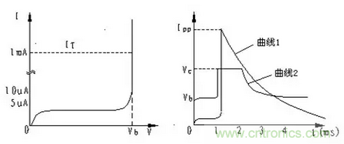 如果用圖示儀觀察TVS的特性,就可得到圖1中左圖所示的波形。如果單就這個曲線來看,TVS管和普通穩(wěn)壓管的擊穿特性沒有什么區(qū)別,為典型的PN結(jié)雪崩器件。